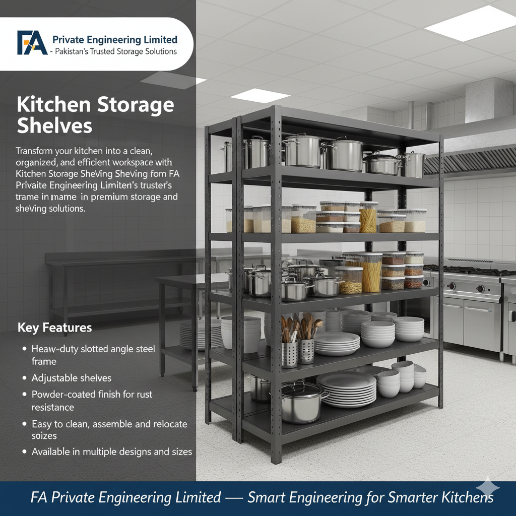 FA Engineering Pvt Ltd is a trusted provider of durable, high-quality kitchen storage shelves across Pakistan. We offer complete services, including design consultation, manufacturing, delivery, and installation. Each shelf is engineered to meet strict quality standards, ensuring long-lasting performance, safety, and reliability.