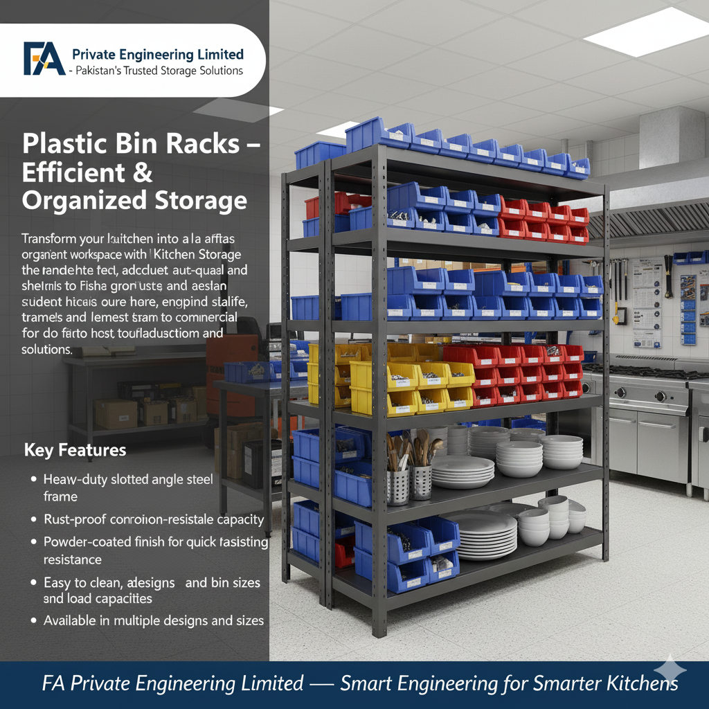 Optimize your storage system with Plastic Bin Racks from FA Engineering Private Limited, Pakistan’s trusted name in industrial and commercial storage solutions.