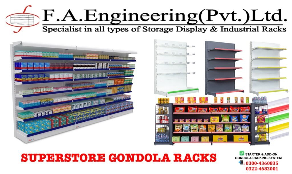 Create a modern, organized, and high-capacity display space with Gondola Racks from FA Engineering Private Limited, a leading manufacturer of supermarket and retail shelving systems in Pakistan.