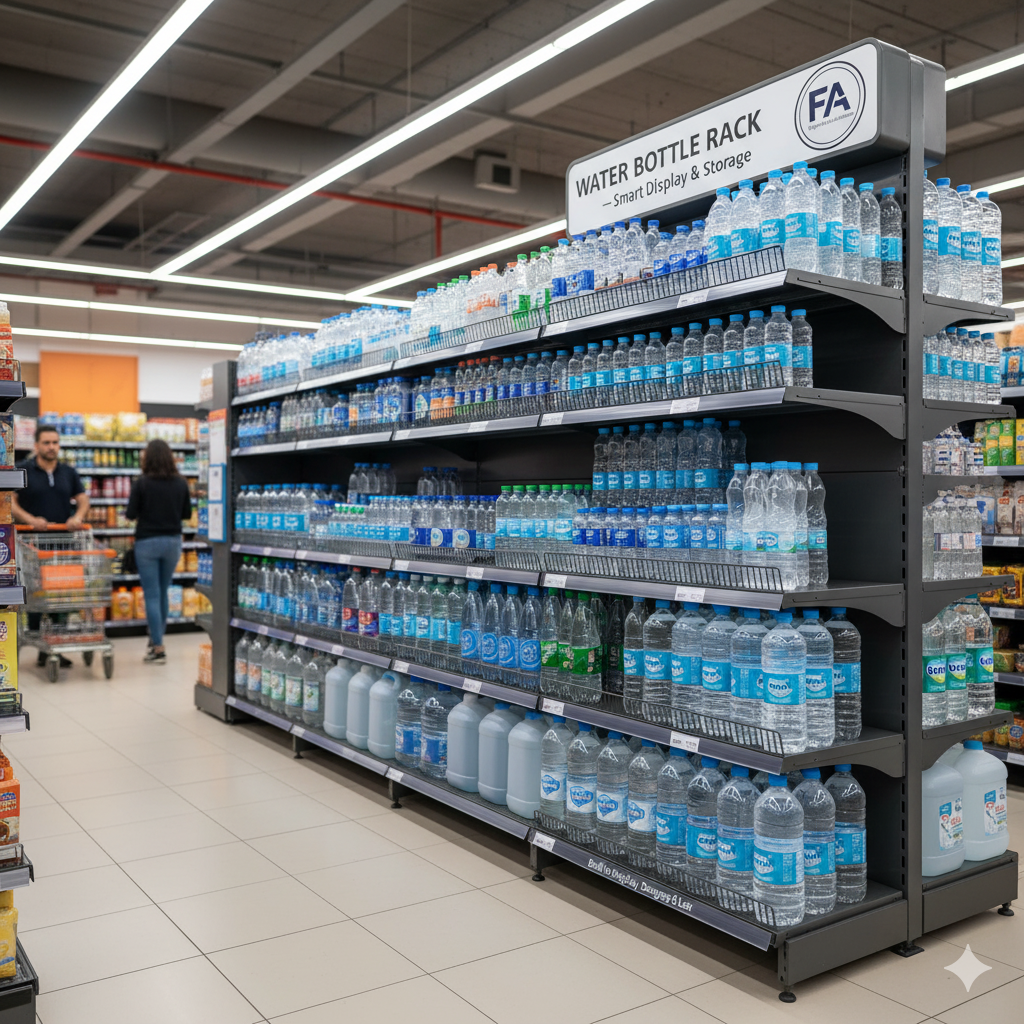 Organize and showcase your bottled water collection efficiently with Water Bottle Racks from FA Engineering Private Limited, a trusted name in supermarket rack manufacturing in Pakistan.